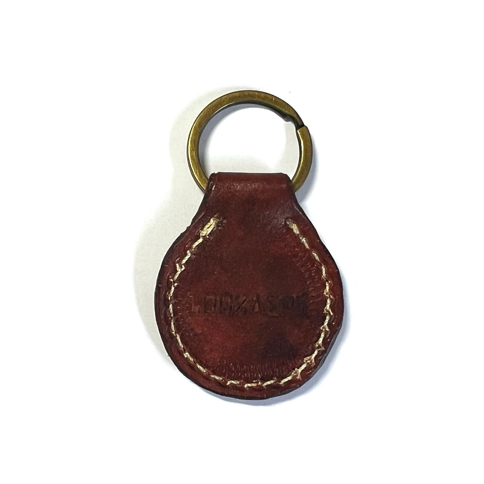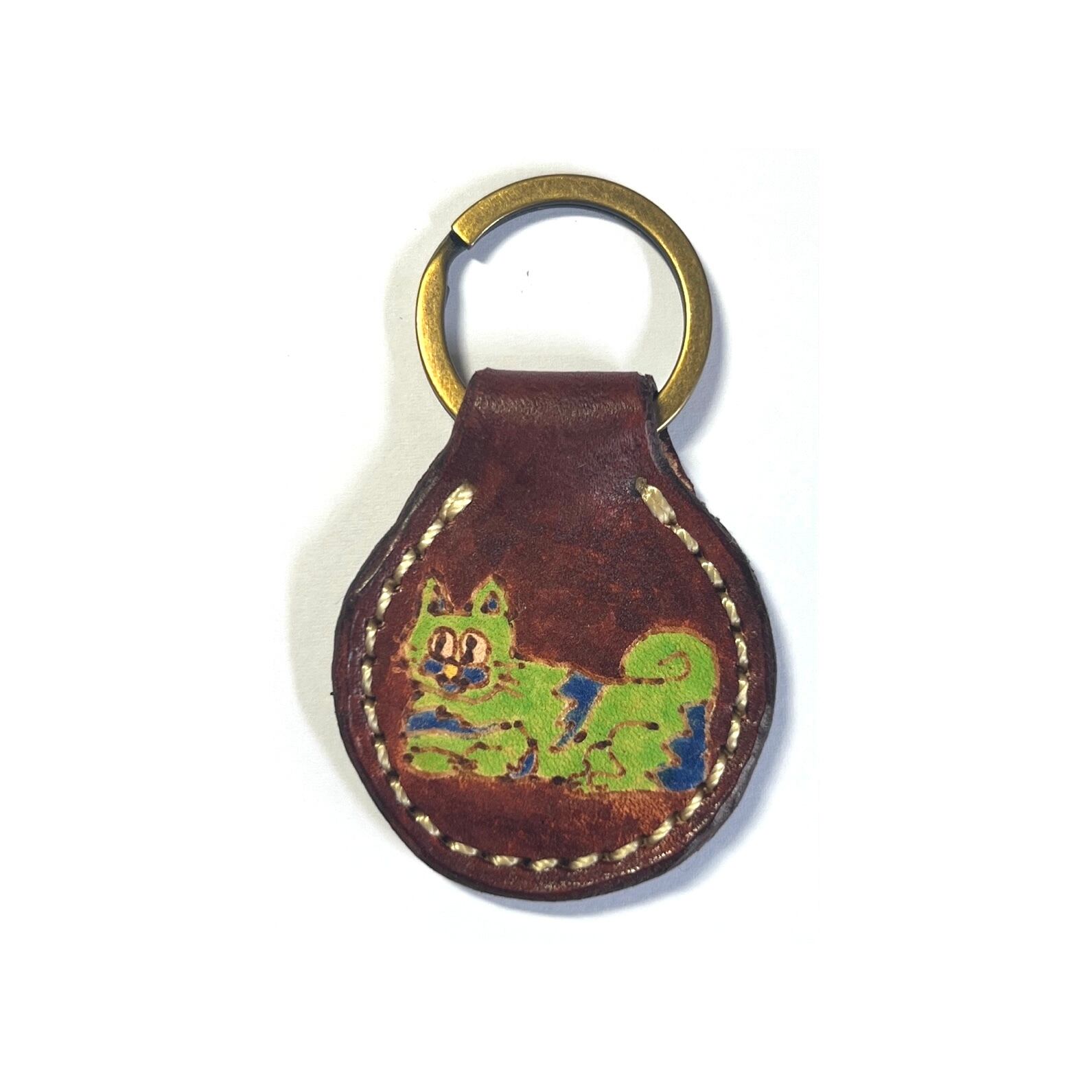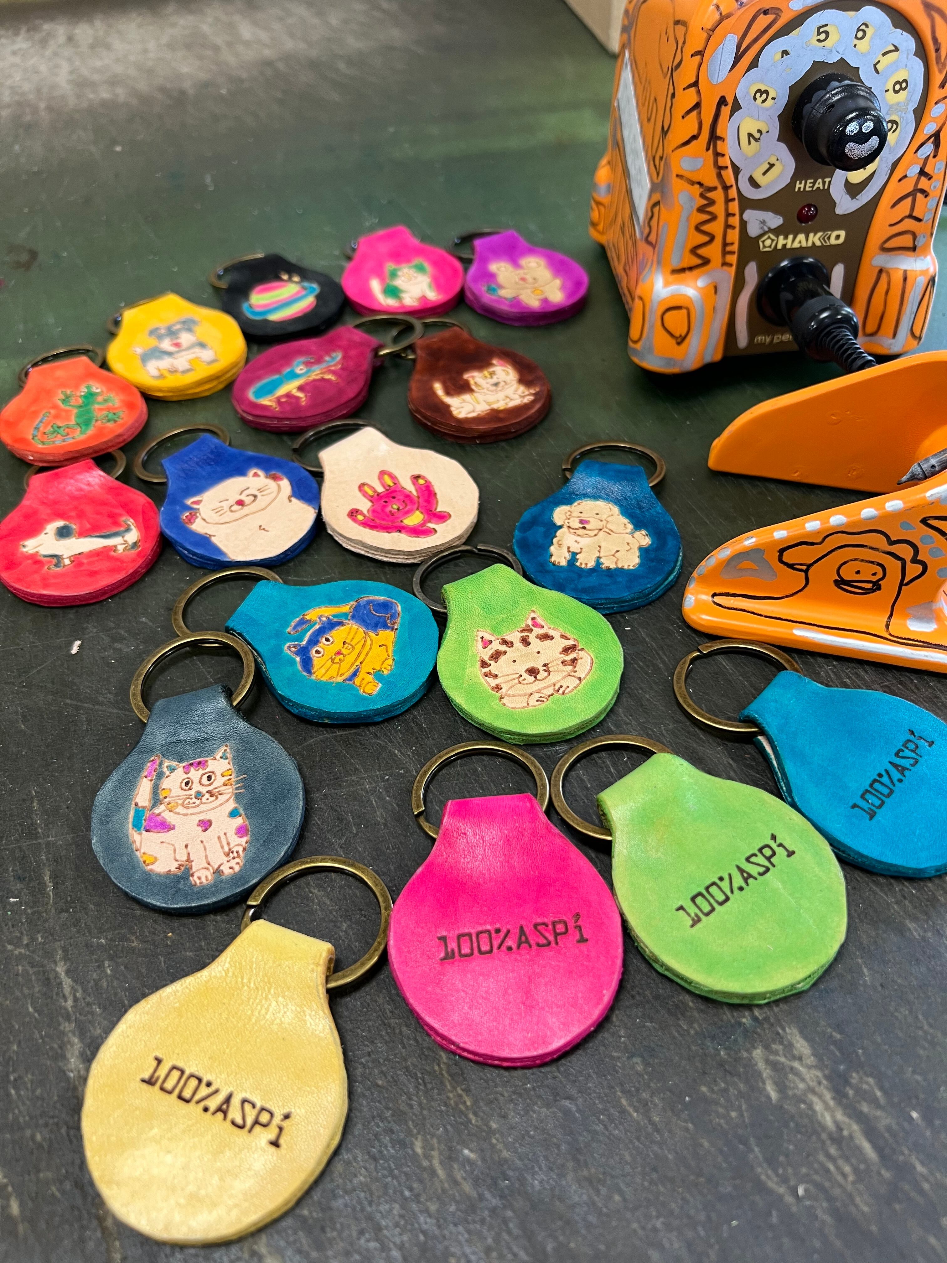 ヌメ牛革に電気ペンで絵を描き、革専用の染料で着色しています。