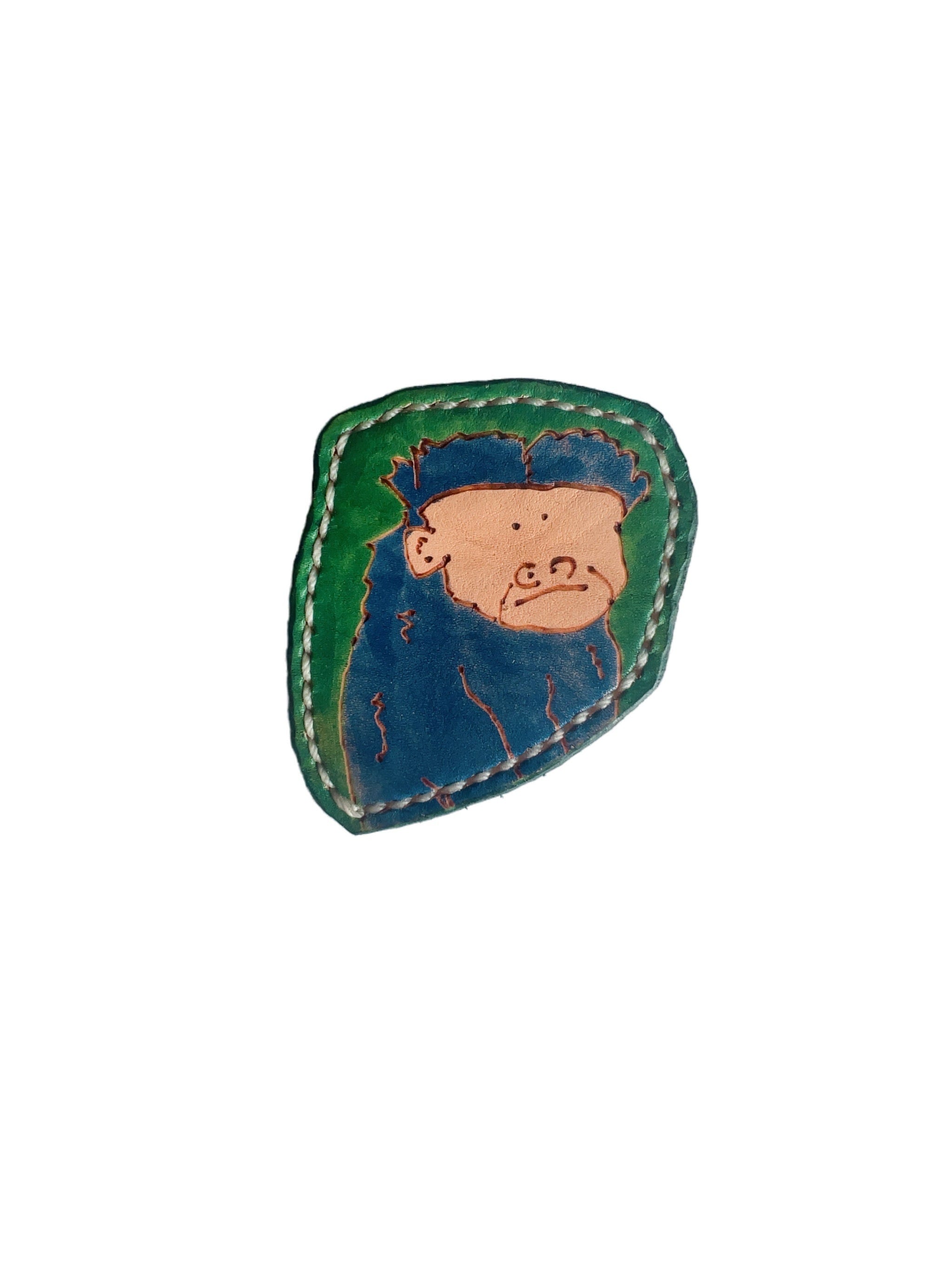 ヌメ牛革に電気ペンで絵を描き、革専用の染料で着色しています。