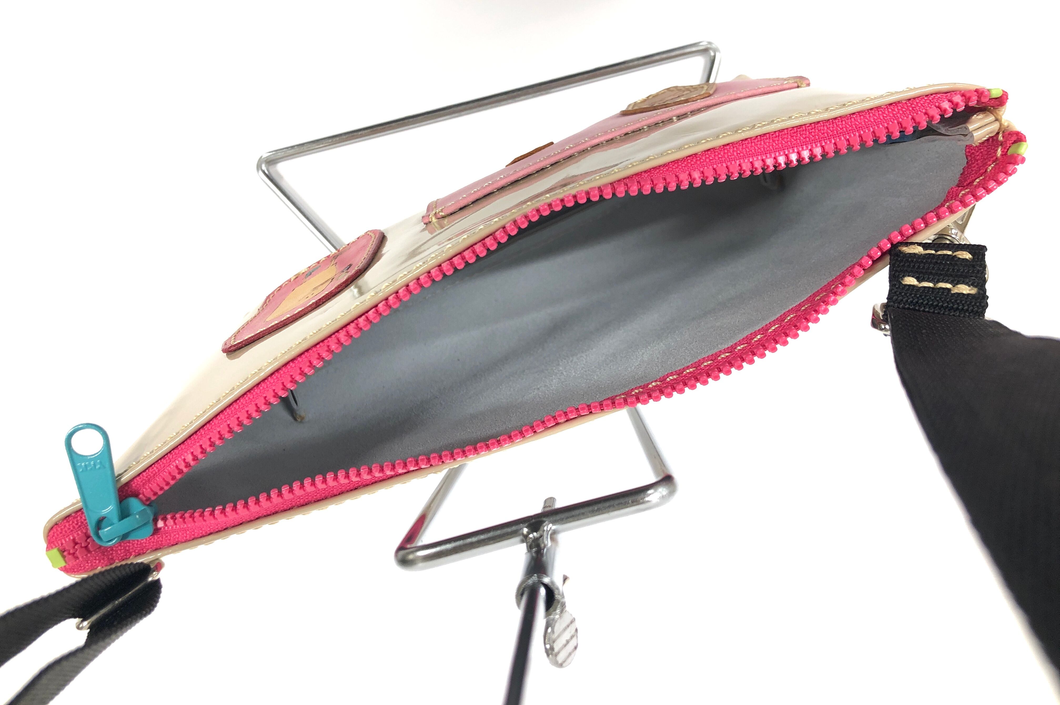 本体はエナメル牛革を、ポケットは起毛素材の牛革を使用しております。