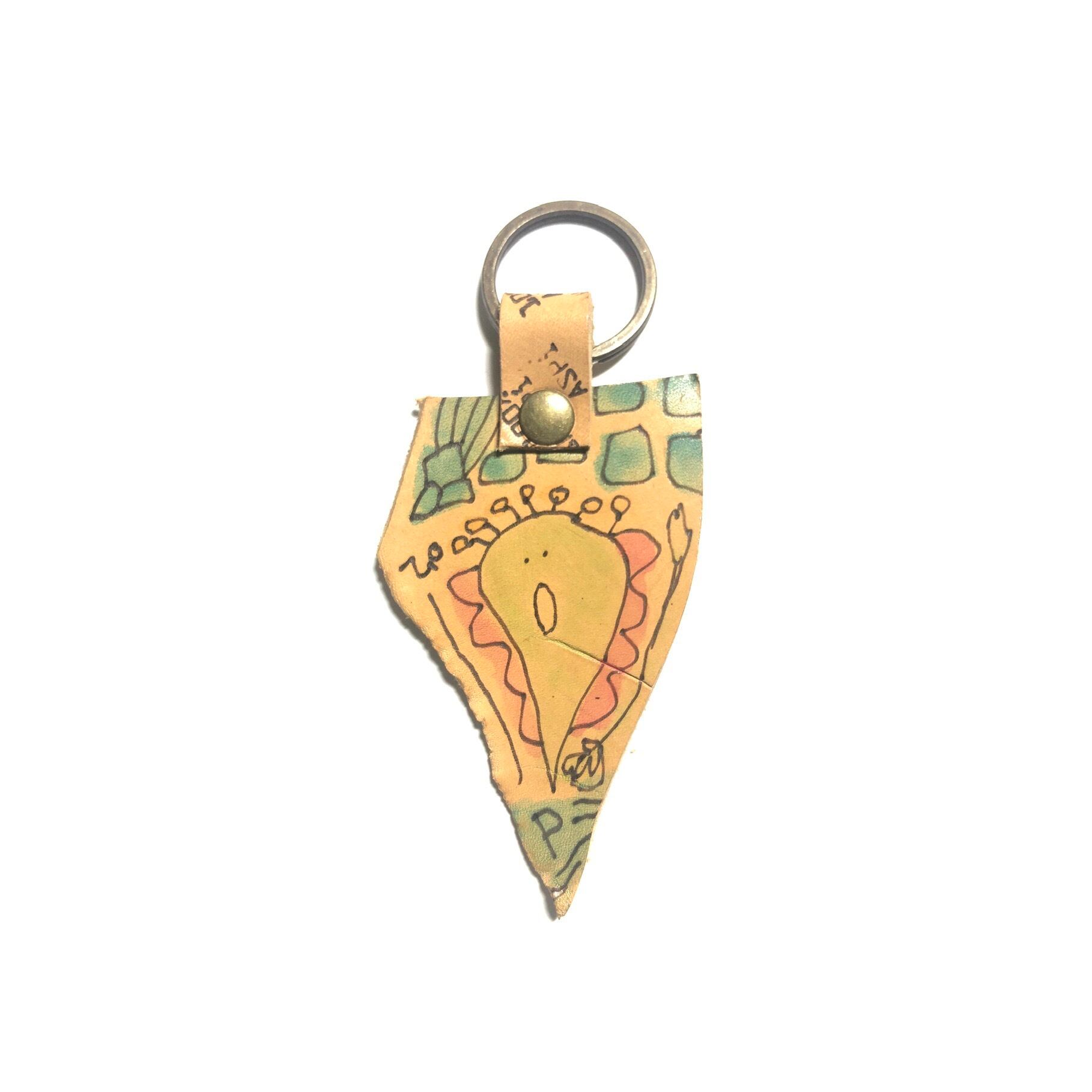 ヌメ牛革に電気ペンで絵を描き、革専用の染料で着色しています。