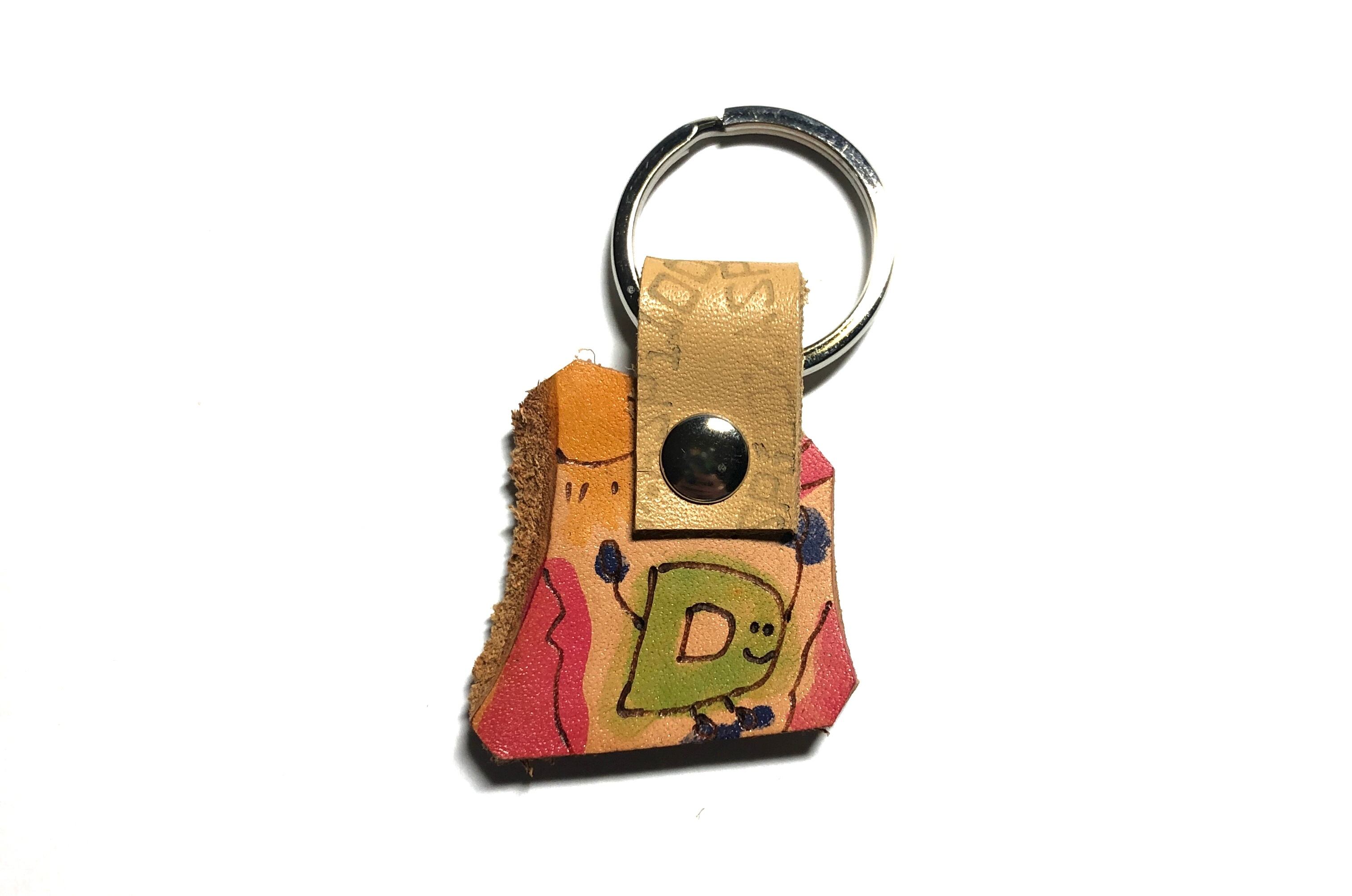 ヌメ牛革に電気ペンで絵を描き、革専用の染料で着色しています。