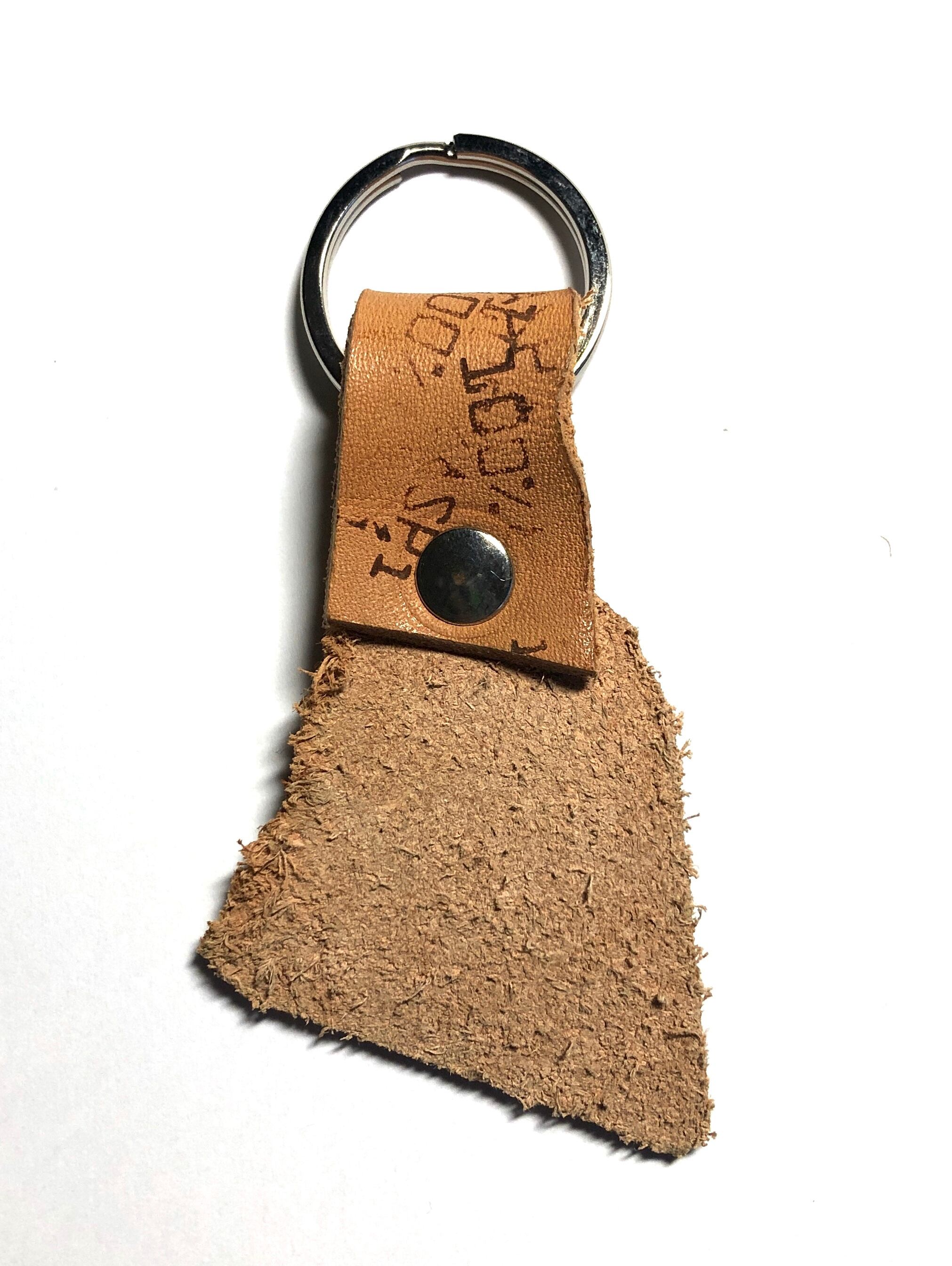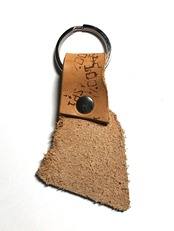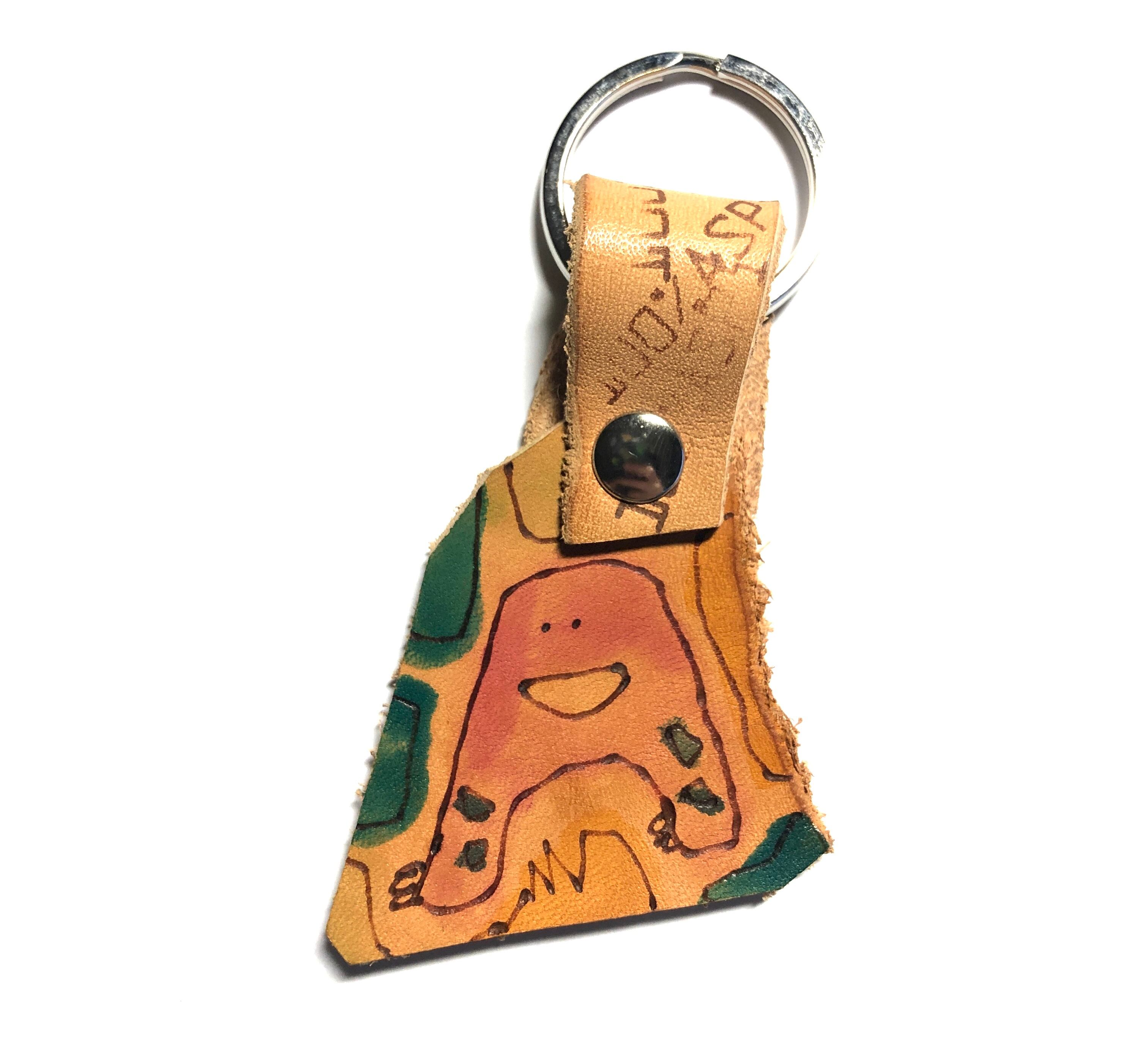 ヌメ牛革に電気ペンで絵を描き、革専用の染料で着色しています。