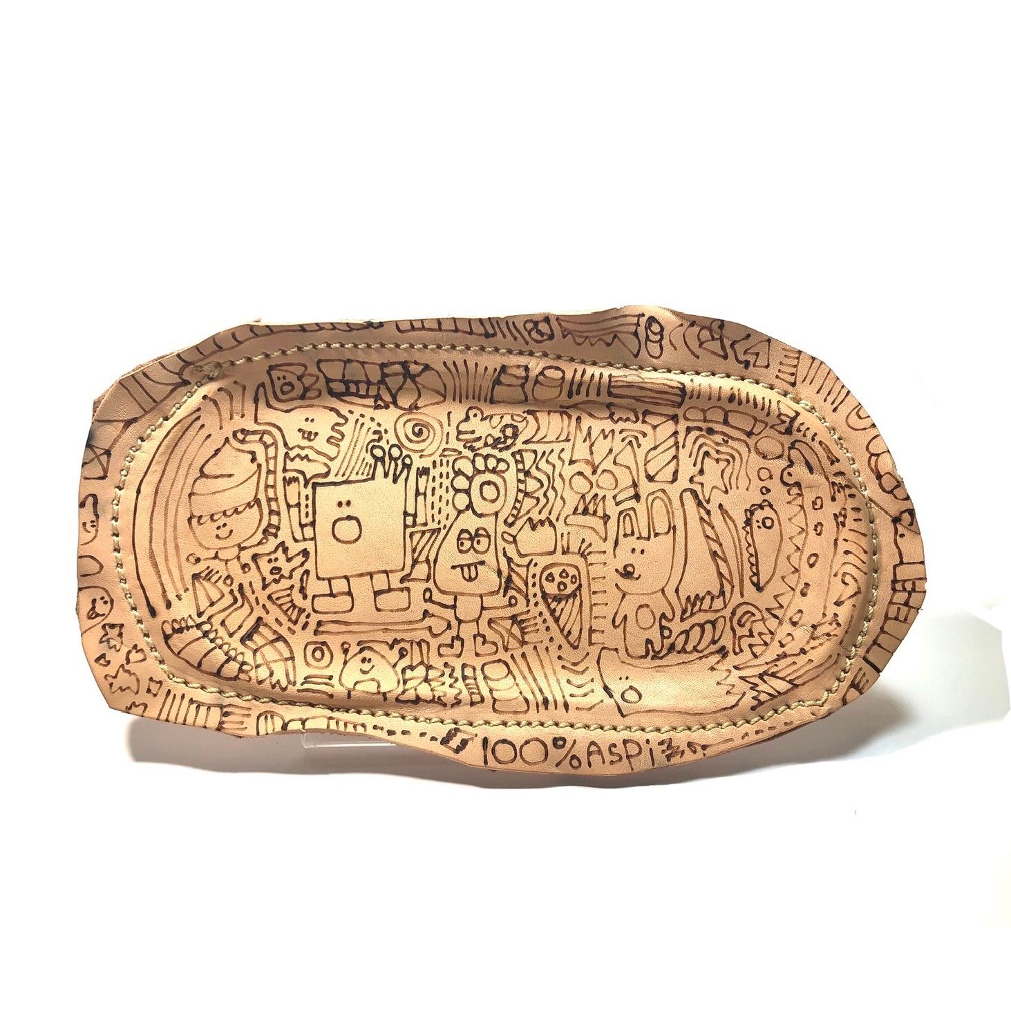 牛ヌメ革に電気ペンで絵を手描きしております。