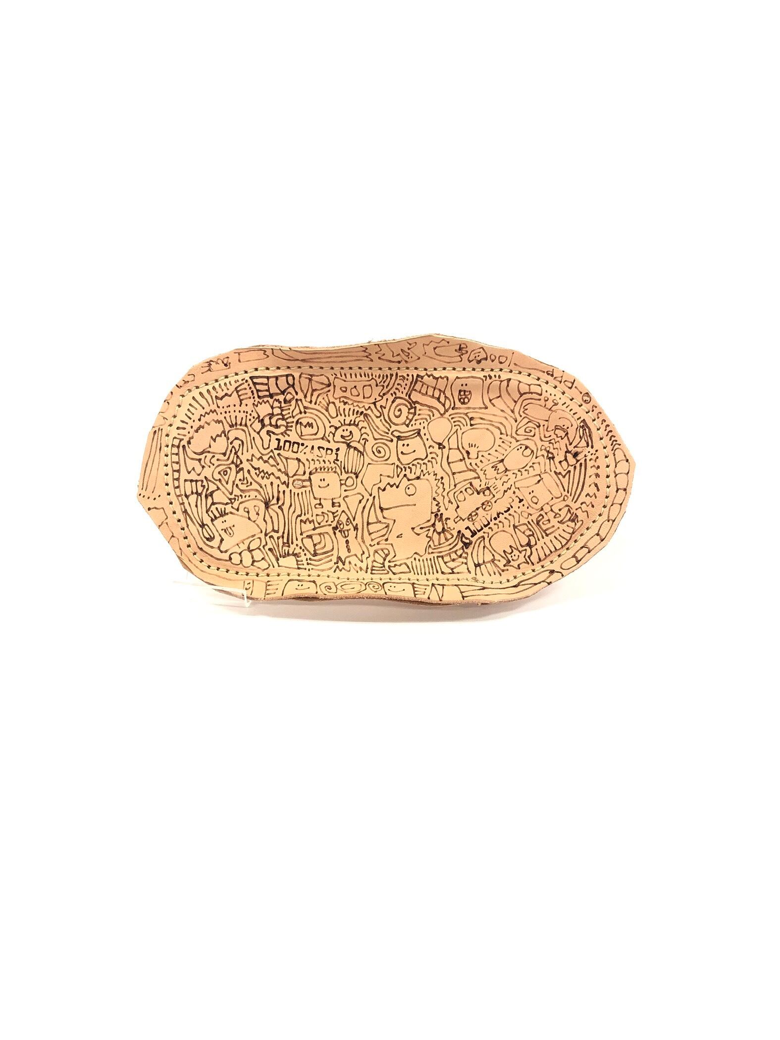 牛ヌメ革に電気ペンで絵を手描きしております。