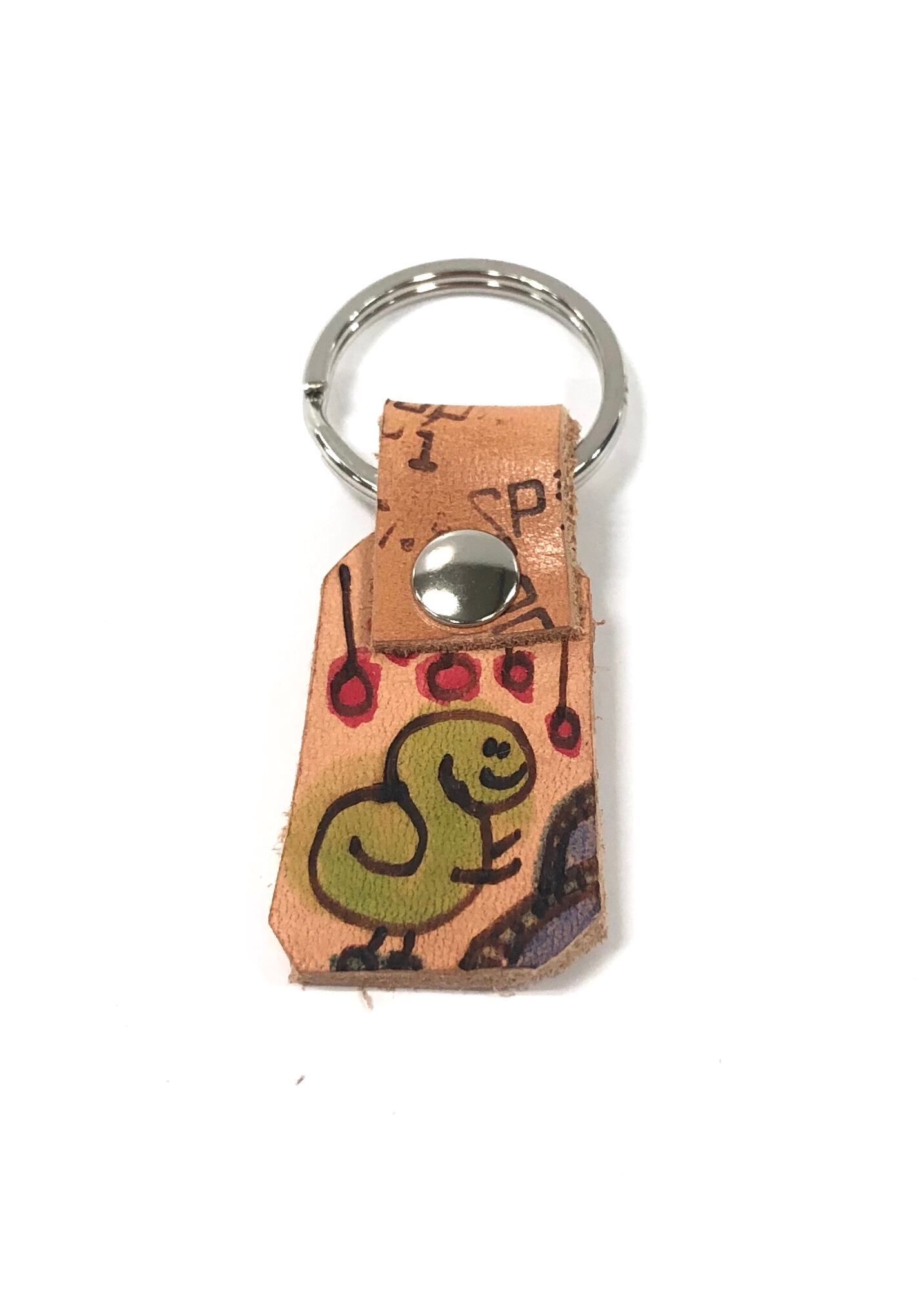 ヌメ牛革に電気ペンで絵を描き、革専用の染料で着色しています。