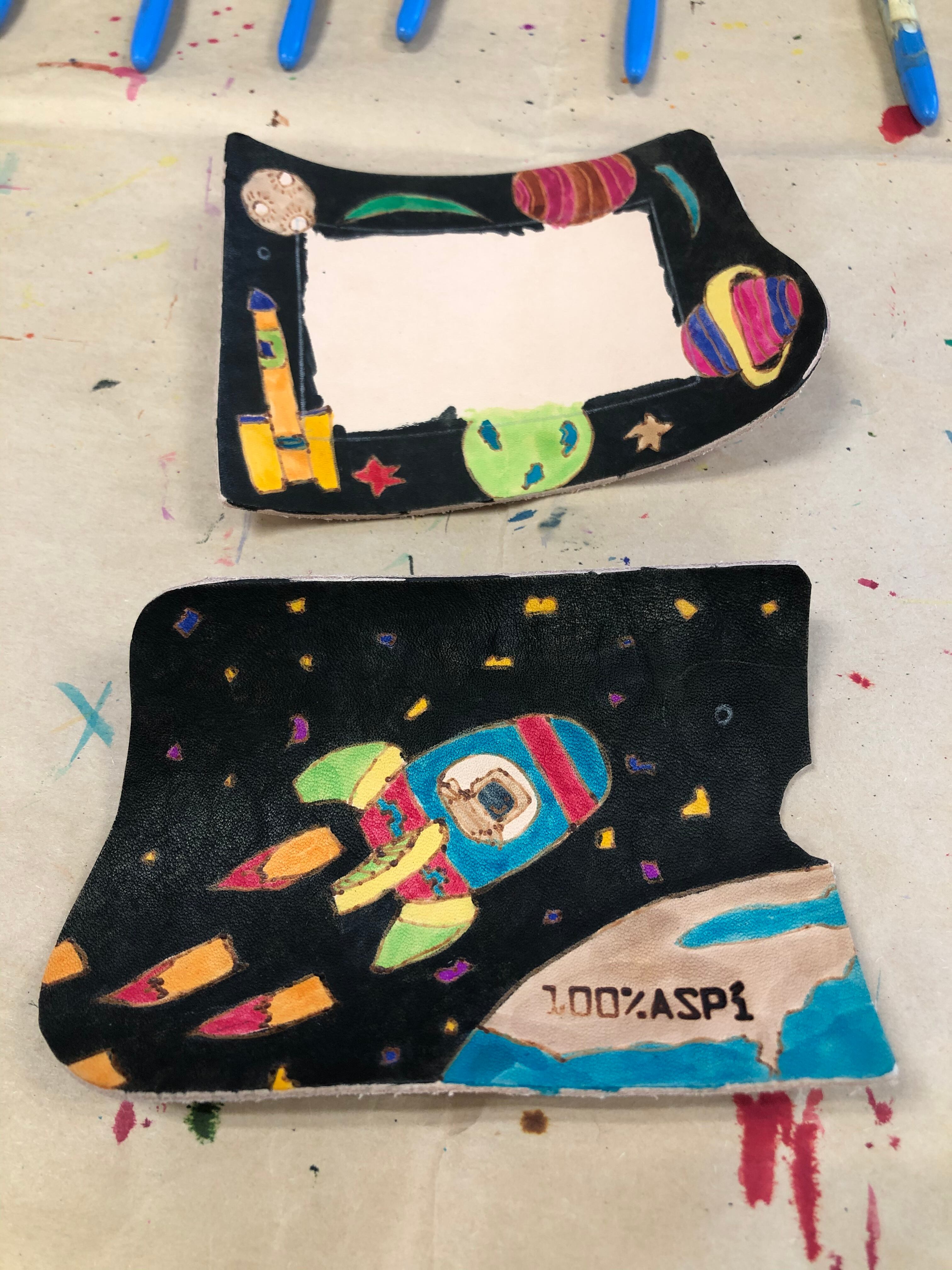 ヌメ牛革に電気ペンで絵を描き、革専用の染料で着色しています。