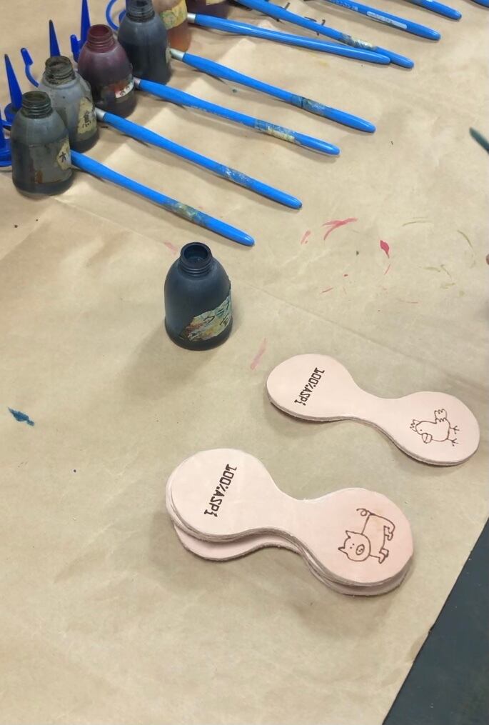 ヌメ牛革に電気ペンで絵を描き、革専用の染料で着色しています。