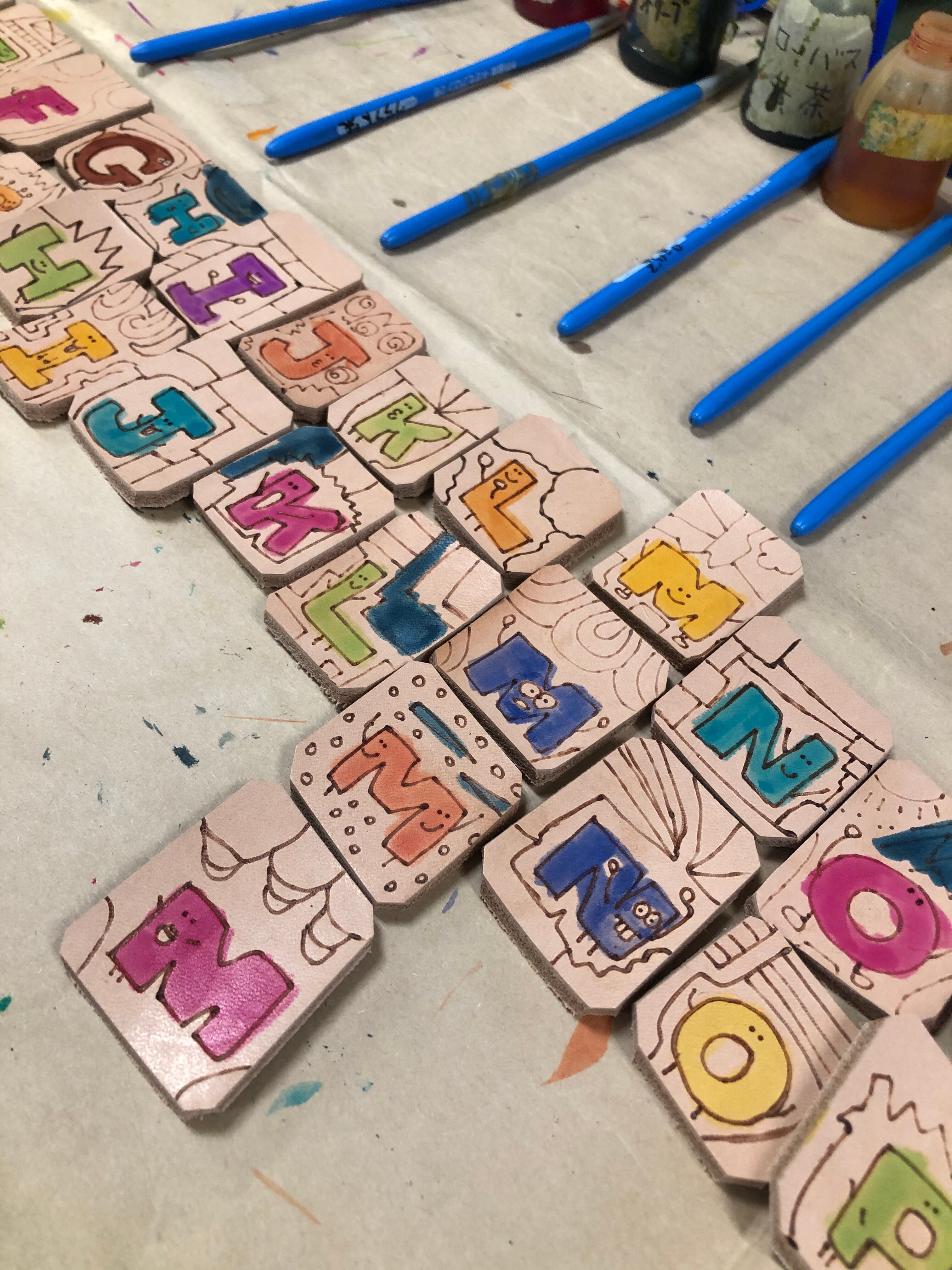 ヌメ牛革に電気ペンで絵を描き、革専用の染料で着色しています。