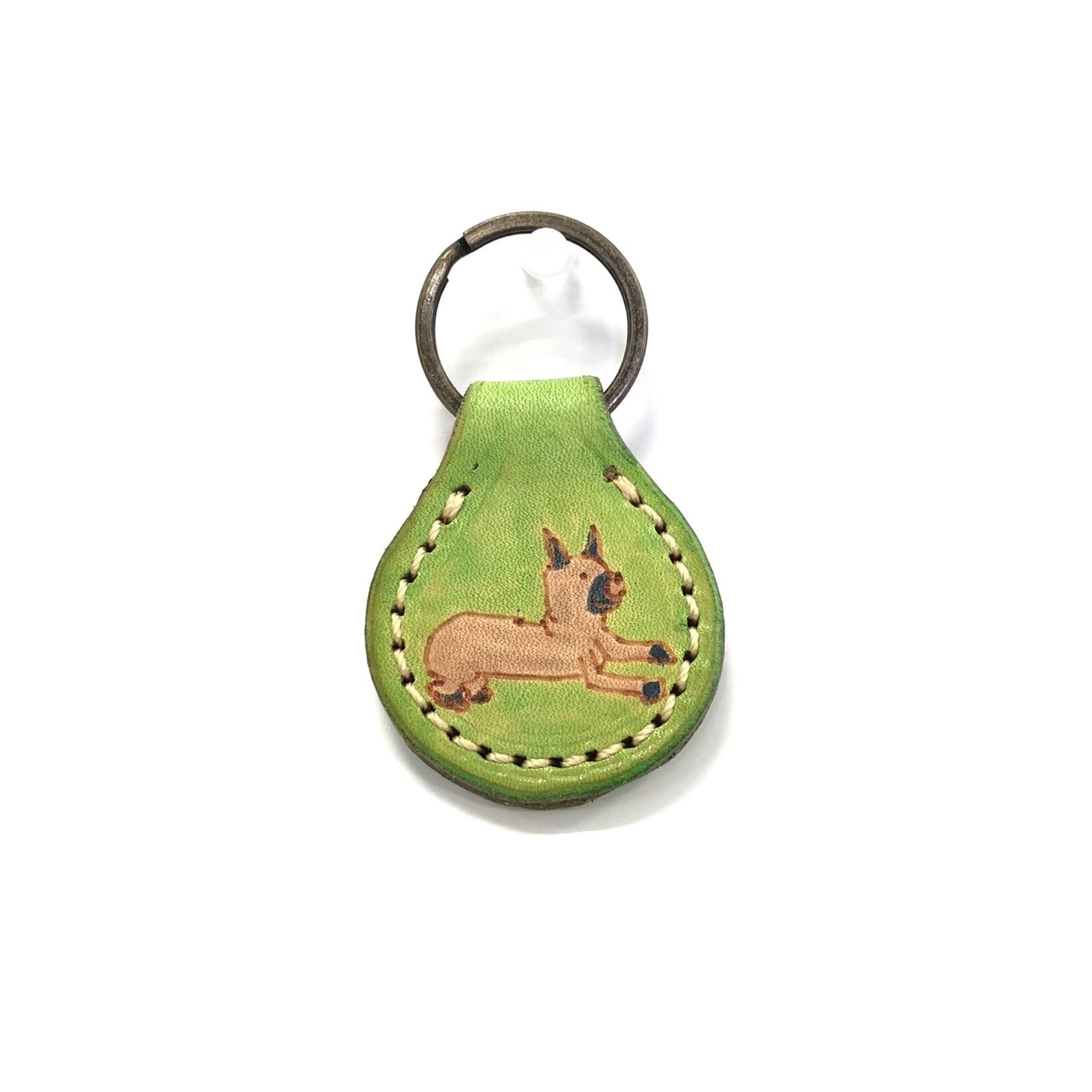 ヌメ牛革に電気ペンで絵を描き、革専用の染料で着色しています。