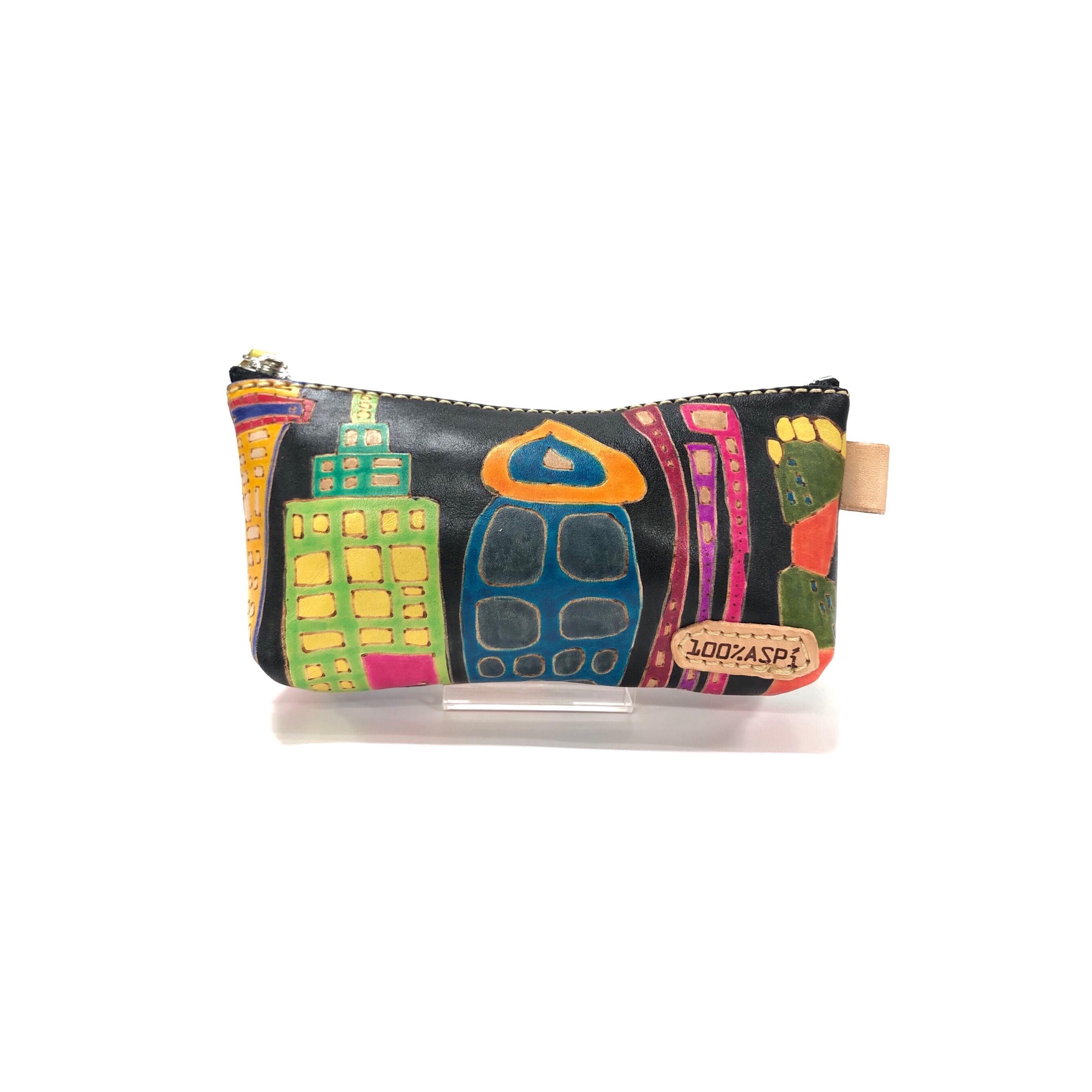 ヌメ牛革に電気ペンで絵を描き、革専用の染料で着色しています。