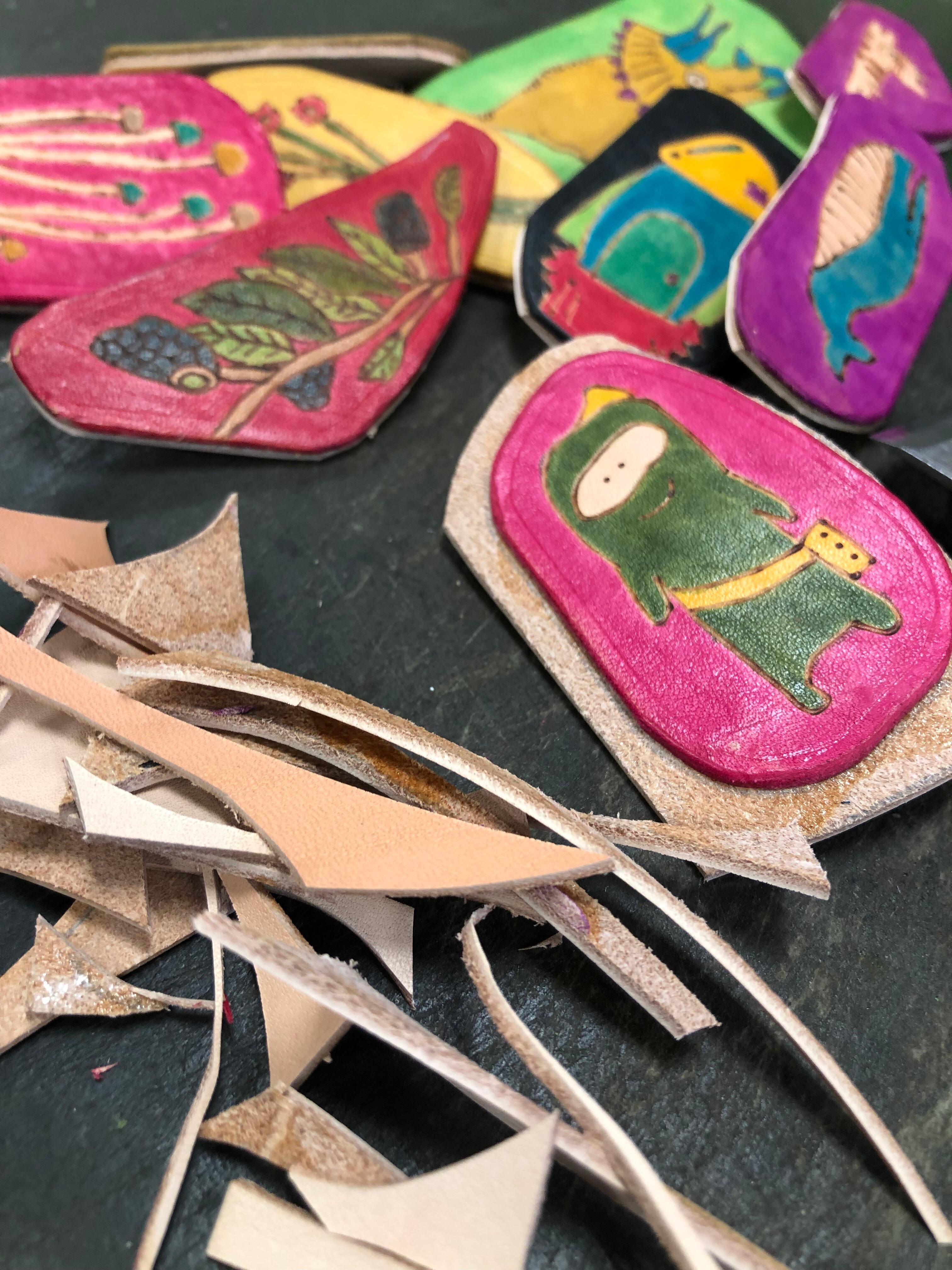 ヌメ牛革に電気ペンで絵を描き、革専用の染料で着色しています。