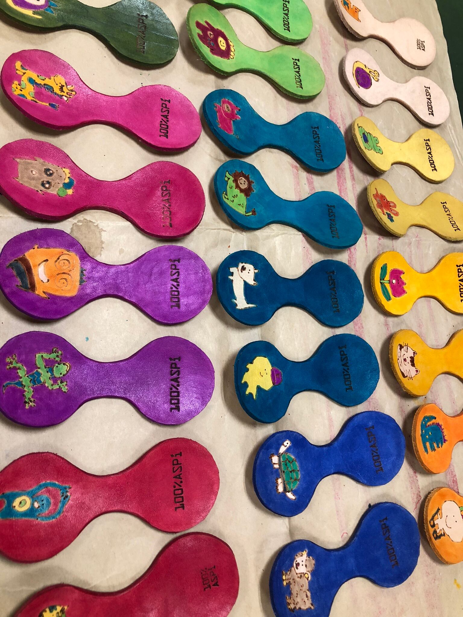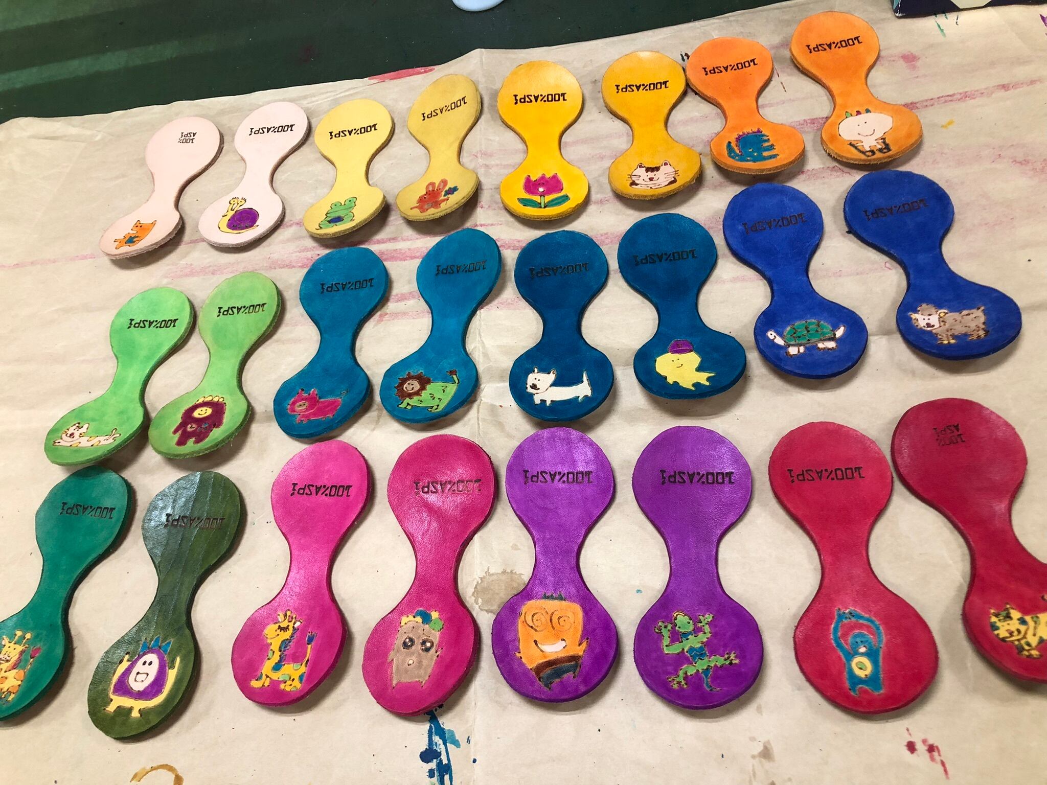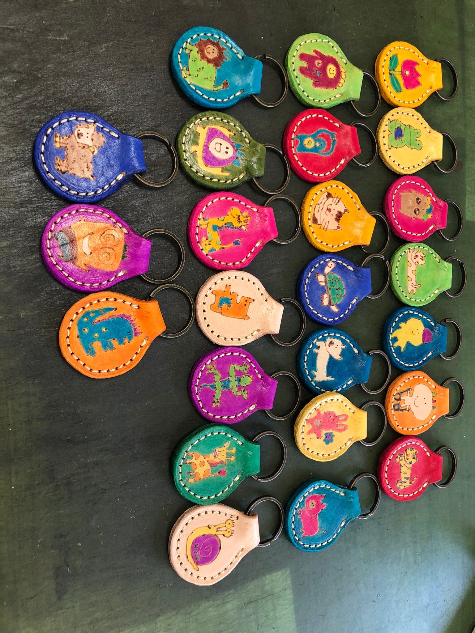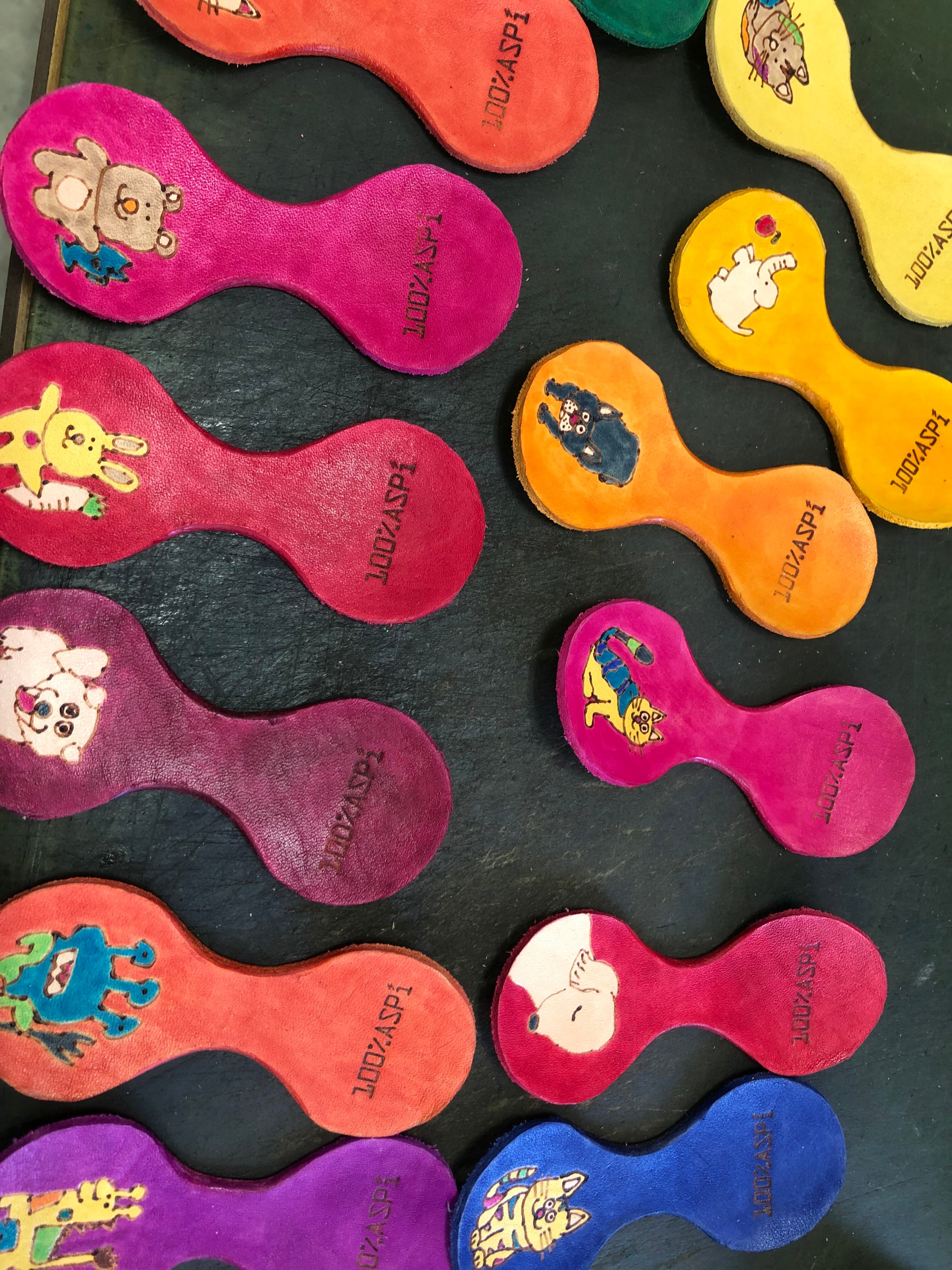ヌメ牛革に電気ペンで絵を描き、革専用の染料で着色しています。