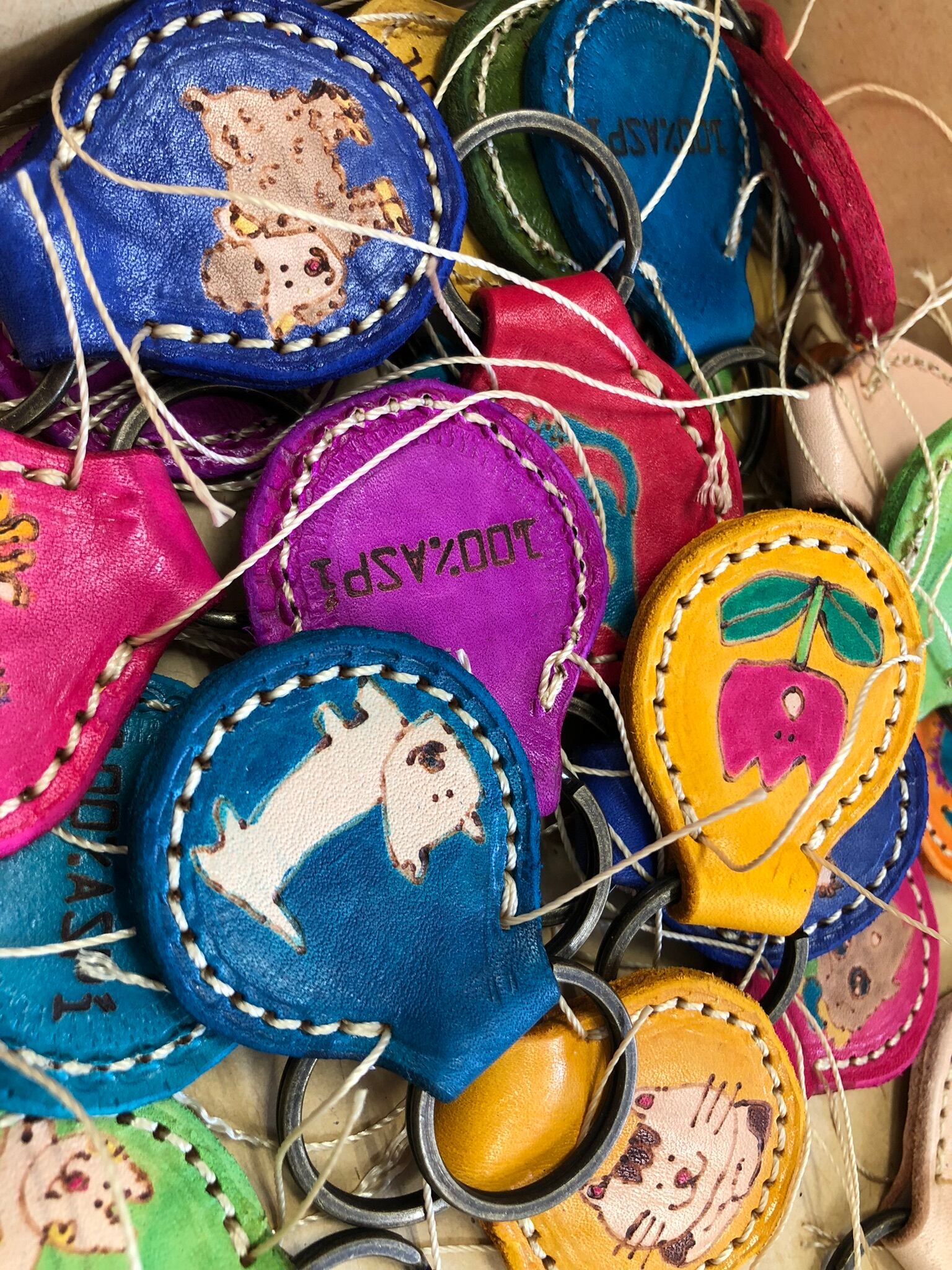 ヌメ牛革に電気ペンで絵を描き、革専用の染料で着色しています。