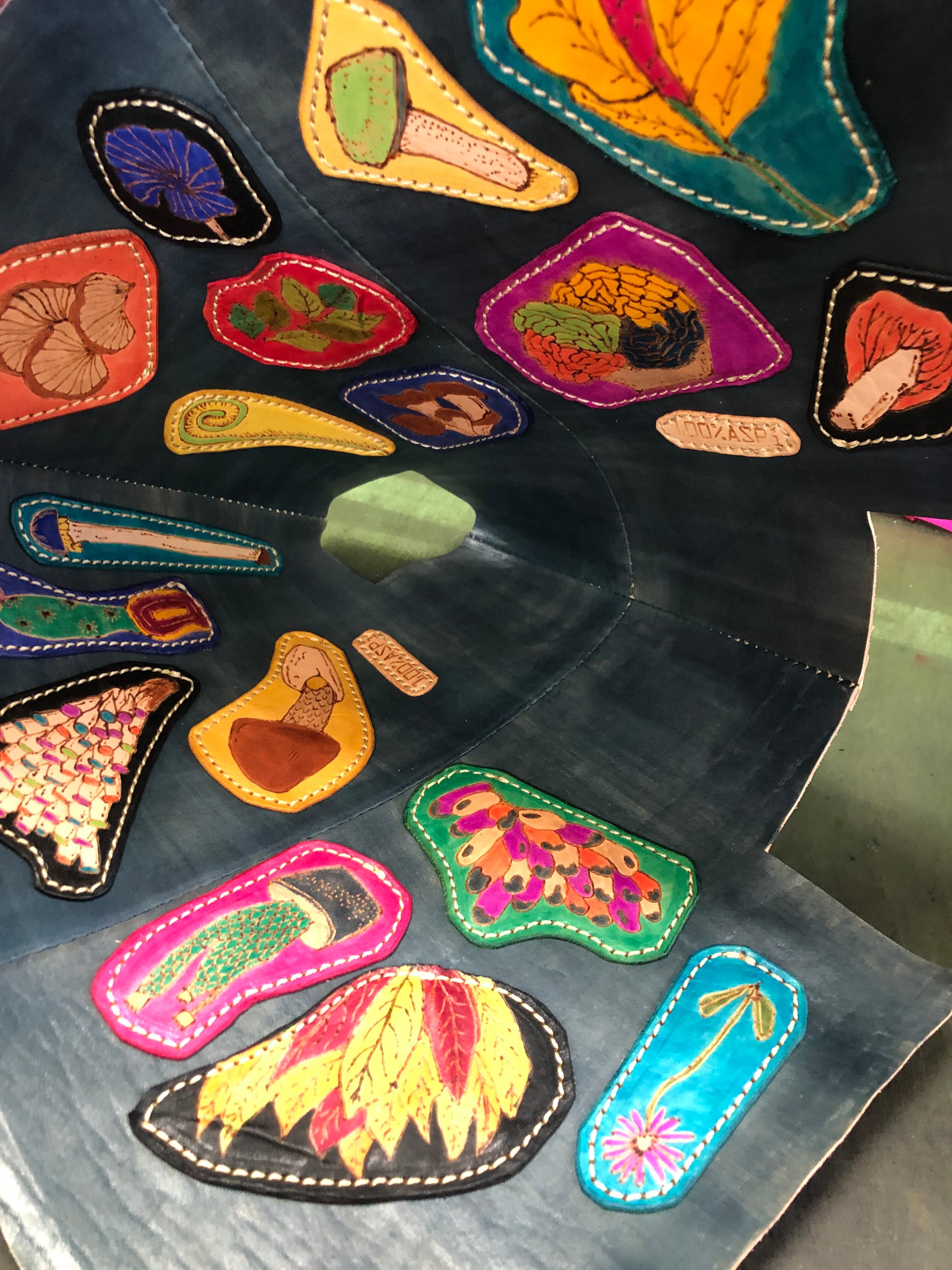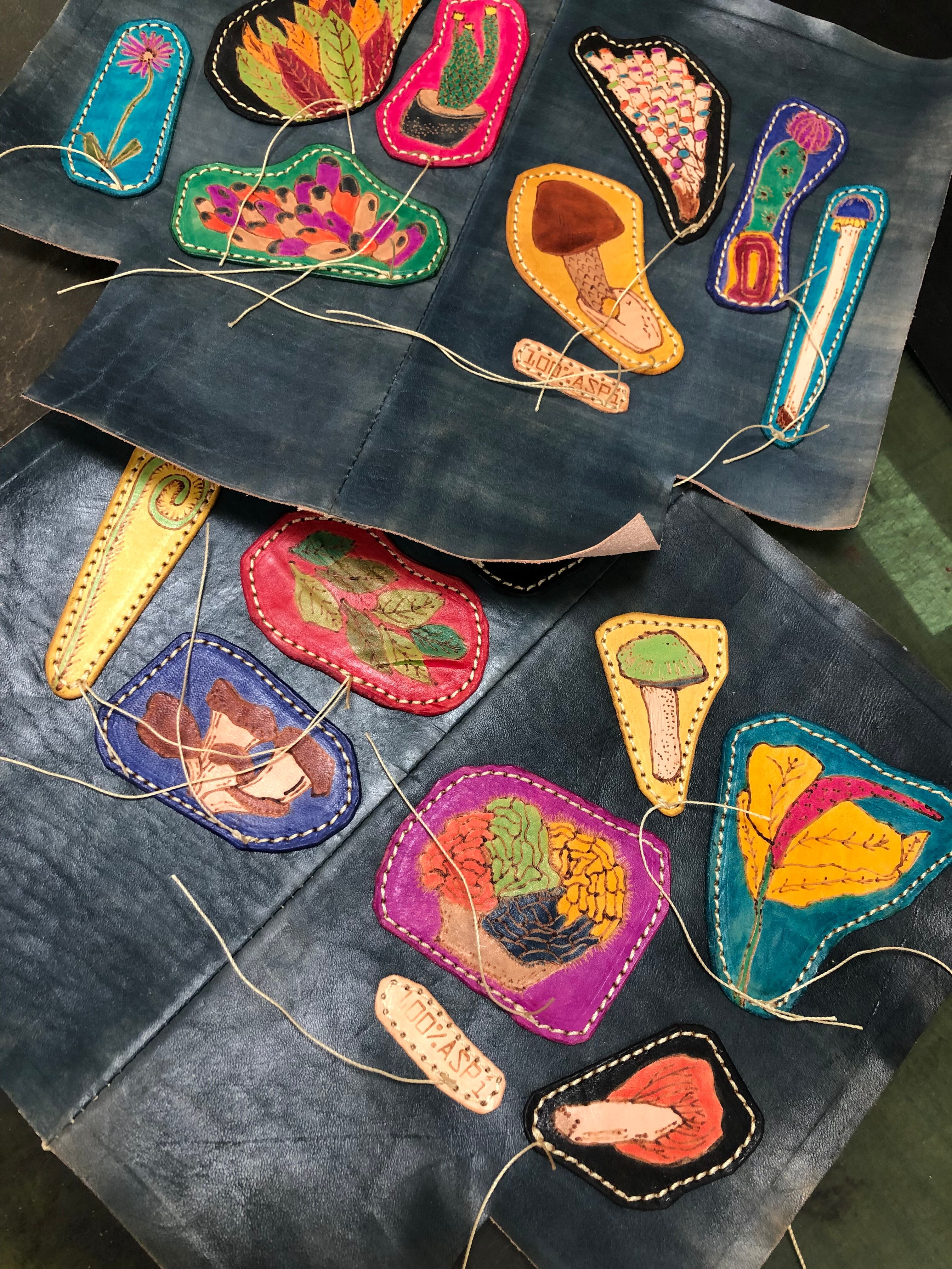 牛ヌメ革に電気ペンで絵を描き、制作しています。