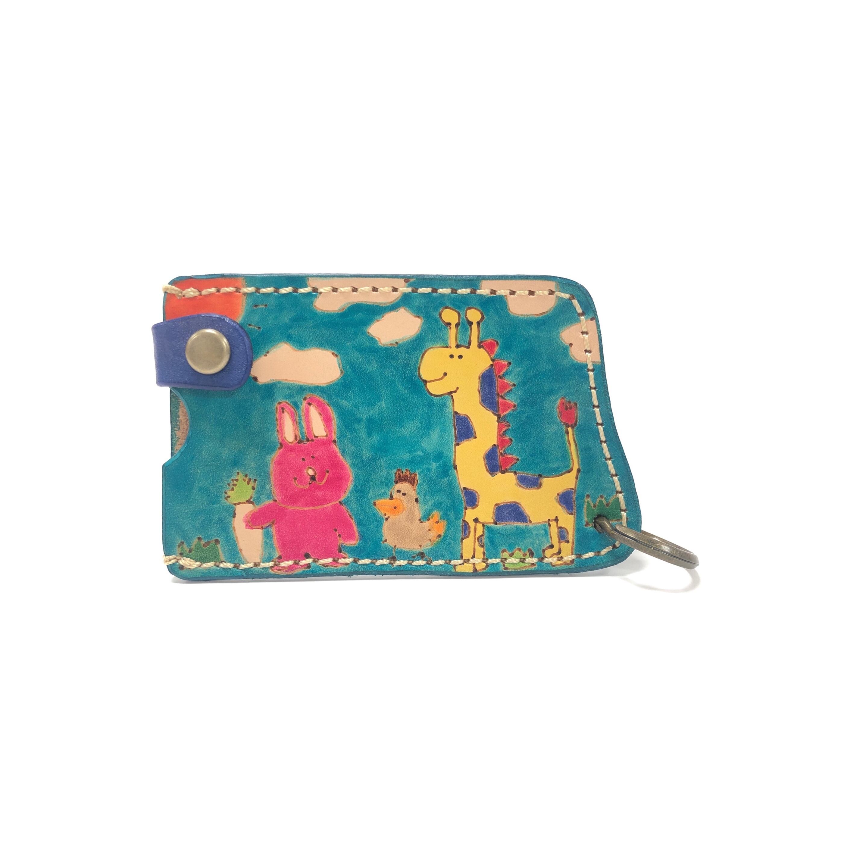 ヌメ牛革に電気ペンで絵を描き、革専用の染料で着色しています。