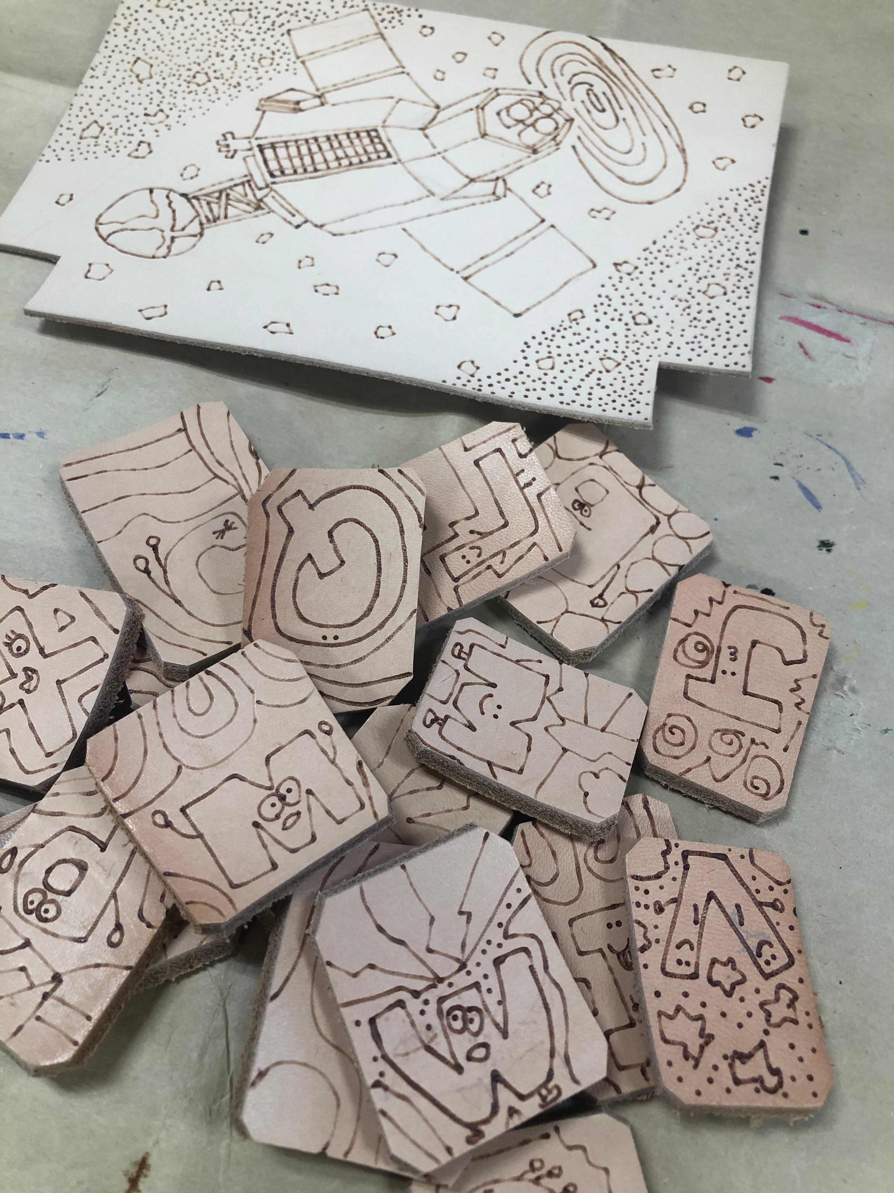 ヌメ牛革に電気ペンで絵を描き、革専用の染料で着色しています。