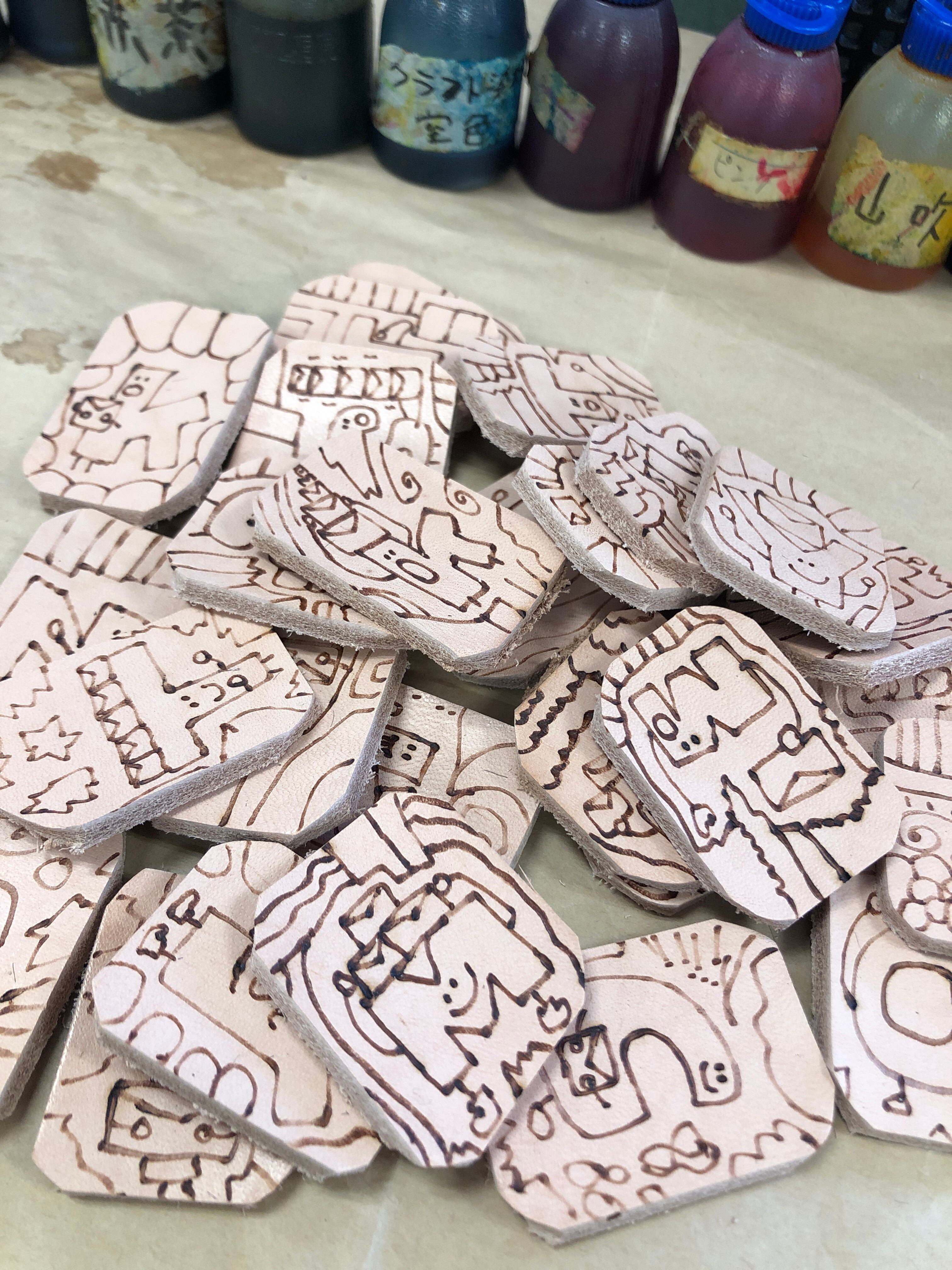 ヌメ牛革に電気ペンで絵を描き、革専用の染料で着色しています。