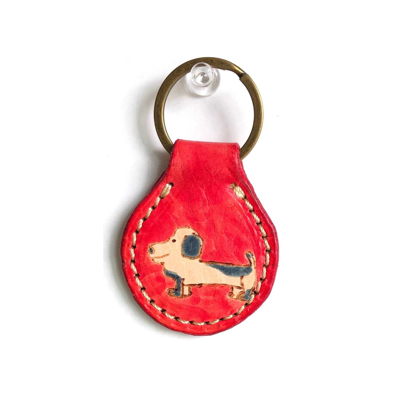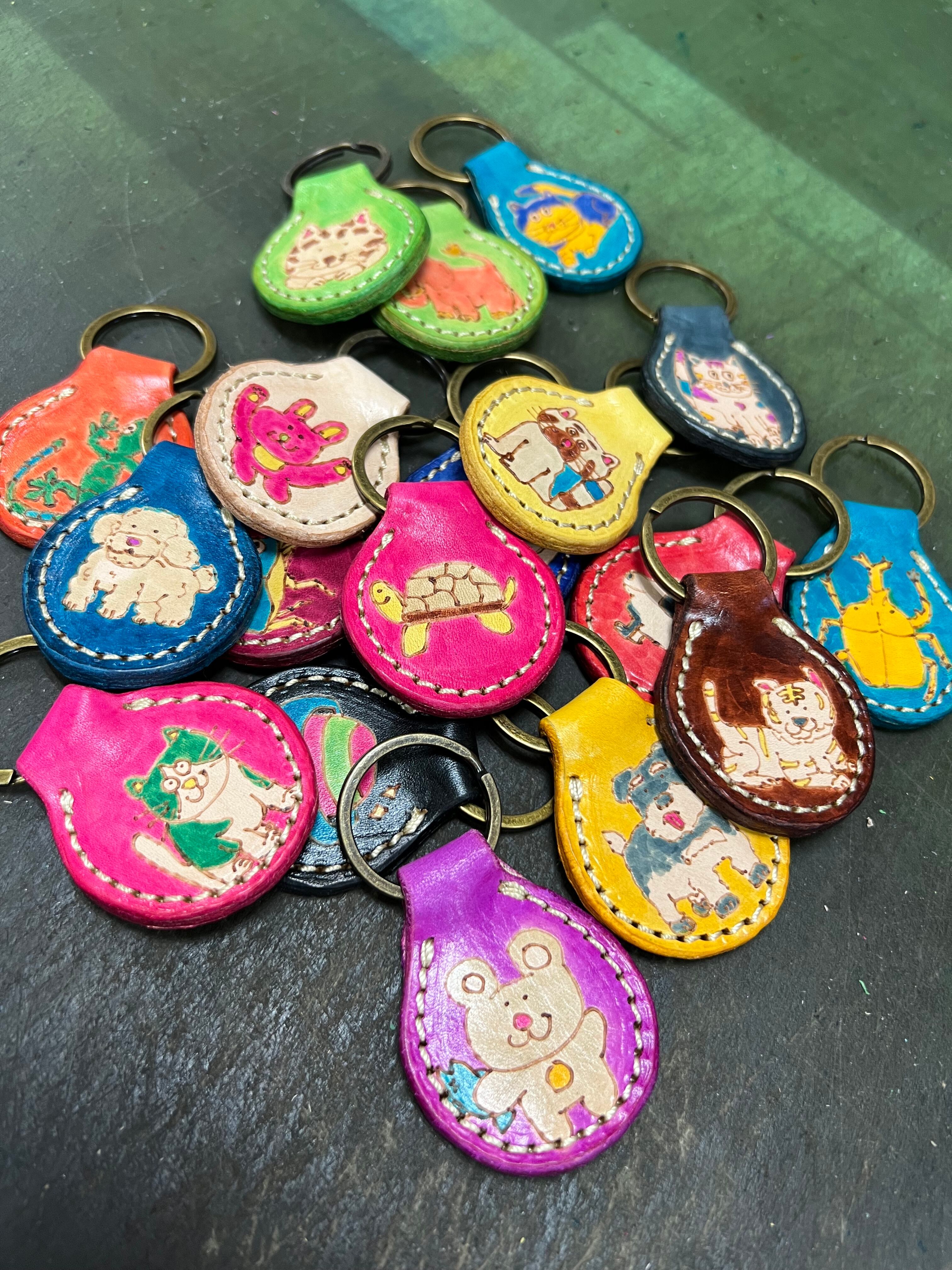 ヌメ牛革に電気ペンで絵を描き、革専用の染料で着色しています。